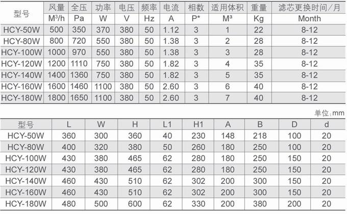 根据不同的机床加工腔体积大小,博迪为每款产品设计出不同的风量,如HCY-W博迪岁月款共有7种不同的风量选型:HCY-50W风量为500m3/h,HCY-80W风量为800m3/h(见下图)。